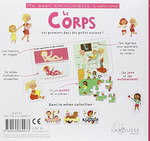 Le corps que votre liste de lecture ou vous serez regretter parce que vous ne l'avez pas lu encore dans votre vie.Rang parmi les ventes Amazon: #68302 dans LivresPublié le: 2013-10-16Langue d'origine: FrançaisDimensions: 7.68" h x .59" l x 8.07" L, Reliure: Album28 pagesExtraitNeuf mois pour naître Dans le ventre de ta maman, ton corps a mis neuf mois à se préparer. Même si plus tard tu ressembles à des personnes de ta famille, tu es unique ! Garçon ou-fille, tu as une tête, deux bras et deux jambes. Seul le sexe est différent et donc aussi la façon de faire pipi !Présentation de l'éditeur- Des petits documentaires de 28 pages sur un thème très apprécié des petits.- Le documentaire comprend 10 doubles-pages de contenu :- Double-page 1 : Neuf mois pour naître- Double-page 2 : Une peau qui t’enveloppe- Double-page 3 : Un squelette et des muscles- Double-page 4 : Le chef, c’est le cerveau !- Double-page 5 : Cinq sens- Double-page 6 : Un cœur et du sang- Double-page 7 : Deux poumons pour respirer- Double-page 8 : Boire, manger et… digérer- Double-page 9 : Un corps qui se transforme- Double-page 10 : Un corps à protéger- La 11ème double-page propose des jeux à résoudre, au moyen de la double-page d’autocollants, sur les thèmes abordés dans les 10 doubles-pages précédentes.- En toute fin d’ouvrage, une enveloppe renfermant un puzzle à construire de 12 pièces.Biographie de l'auteurAnne Jonas a travaillé plusieurs années en librairie. Aujourd’hui, elle se consacre à l’écriture de documentaires et de contes.illustratrice et graphiste free lance, Aurélie collabore pour la 1ère fois avec les Éditions LarousseVous trouverez ci-dessous les commentaires du lecteur après avoir lu Le corps. Vous pouvez considérer pour votre référence.